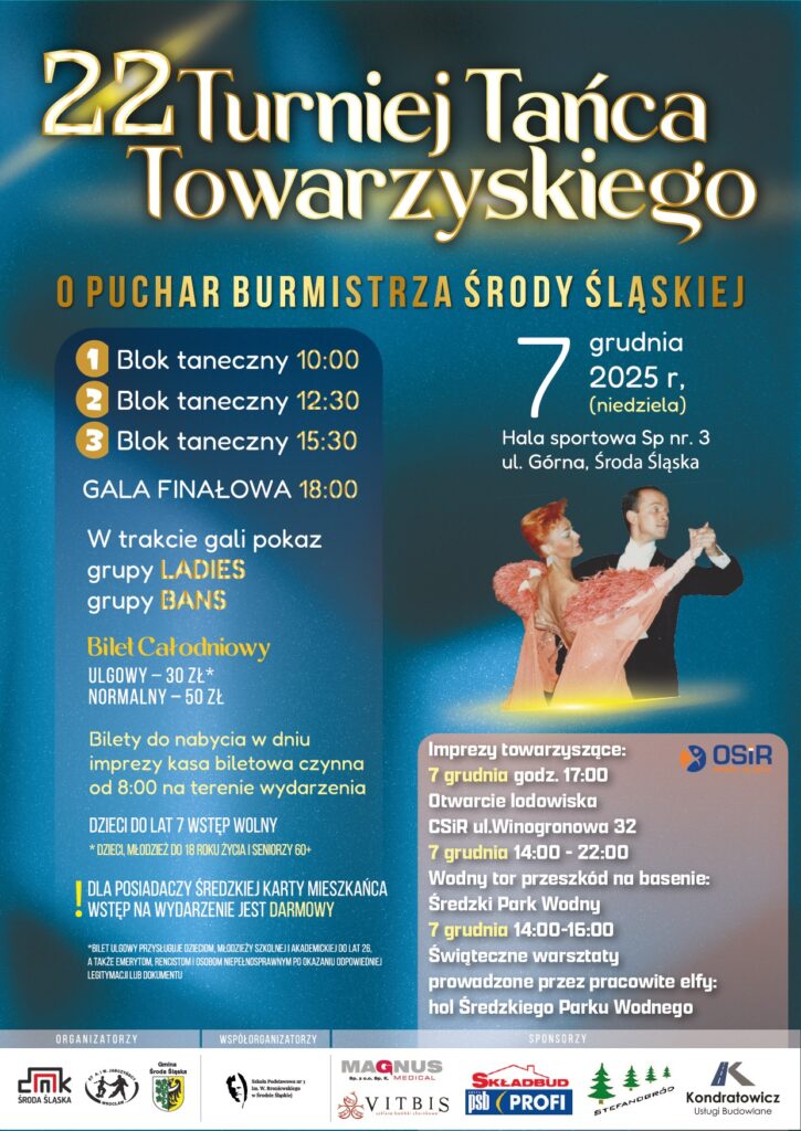 Jeśli po wodnych szaleństwach macie ochotę na coś równie efektownego, zapraszamy na prawdziwą ucztę dla oka i duszy – 22. Turniej Tańca Towarzyskiego o Puchar Burmistrza Środy Śląskiej.