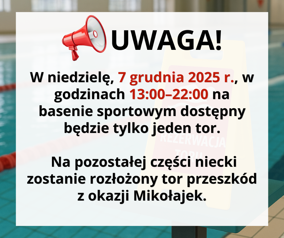 Uprzejmie informujemy, że w niedzielę, 7 grudnia 2025 r., w godzinach 13:00–22:00, na basenie sportowym dostępny będzie tylko jeden tor pływacki.Na pozostałej części niecki zostanie rozłożony tor przeszkód z okazji Mikołajek. Przepraszamy za ewentualne niedogodności i zachęcamy do skorzystania z przygotowanych atrakcji.