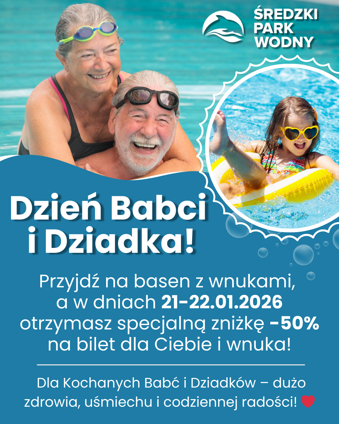 Już jutro świętujemy Dzień Babci, a 22 stycznia – Dzień Dziadka! Z tej okazji przygotowaliśmy SUPER PROMOCJĘ, bo najlepsze chwile to te spędzone razem PROMOCJA -50% NA WEJŚCIE! Zniżka obowiązuje dla Babci i Dziadka oraz wnuka, Warunek: przyjdźcie razem Przykład? Jeśli jesteś emerytem, a dziecko ma status ucznia, to za bilet 2-godzinny na basen po […]