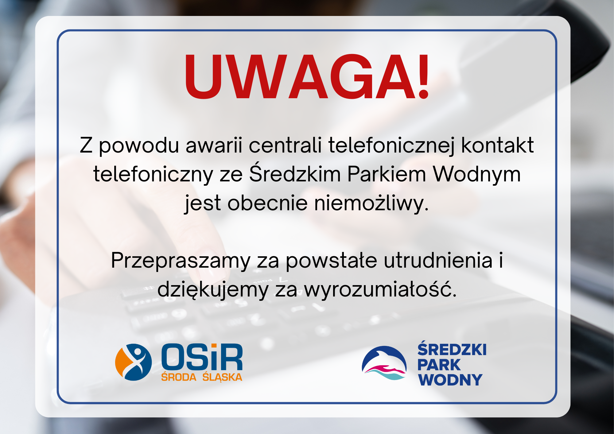 Drodzy klienci, z powodu awarii centrali telefonicznej kontakt telefoniczny ze Średzkim Parkiem Wodnym jest obecnie niemożliwy. O przywróceniu działania telefonów poinformujemy niezwłocznie po usunięciu awarii. Przepraszamy za powstałe utrudnienia i dziękujemy za wyrozumiałość.