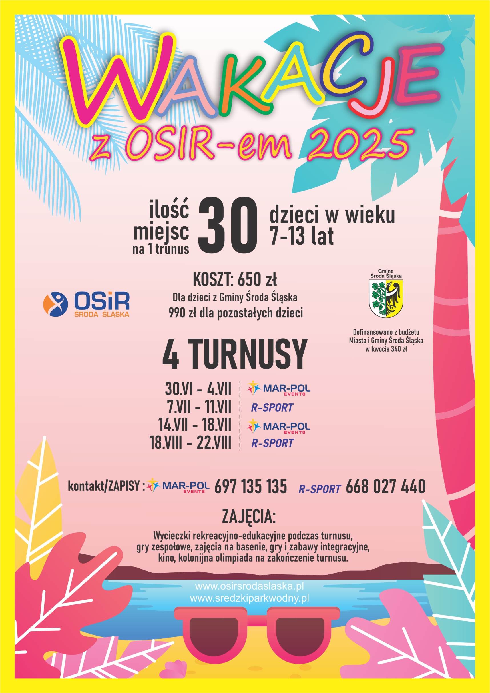 Drodzy Rodzice, Szukacie pomysłu na aktywne i bezpieczne wakacje dla Waszego dziecka? Letnie kolonie z OSiR-em w Środzie Śląskiej to świetna zabawa, ruch na świeżym powietrzu i niezapomniane przygody. Jak zawsze będzie mnóstwo atrakcji – a Wy zyskacie trochę wakacyjnego oddechu! Szczegółowe informacje na plakacie. Zapraszamy!