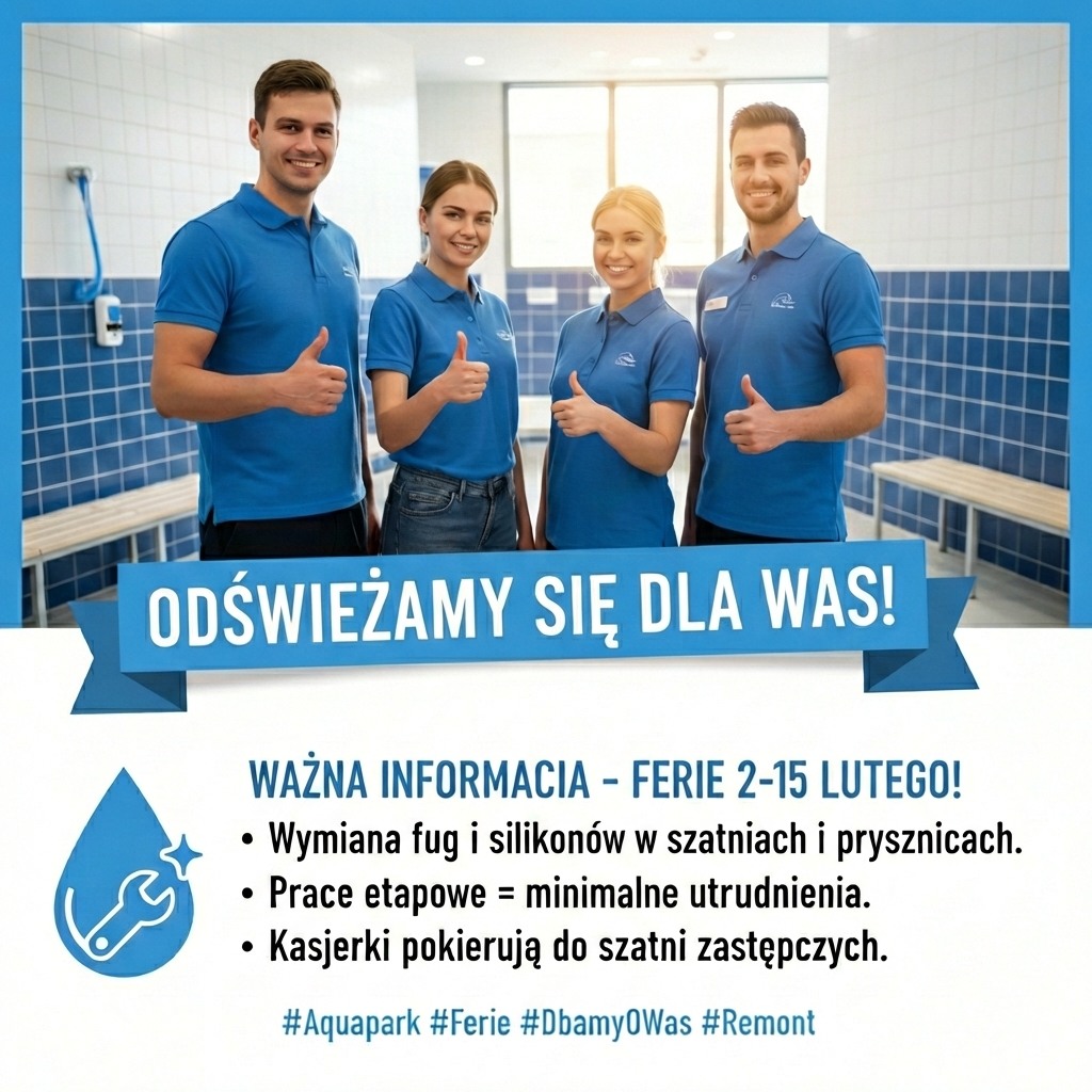 W dniach 2-15 lutego w strefie szatni i pryszniców będą prowadzone prace konserwacyjne (wymiana fug i silikonów).